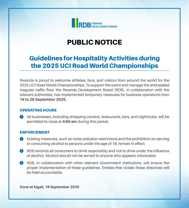 The Rwanda Development Board (RDB) has issued temporary hospitality guidelines for the UCI Road World Championships, granting extended operating hours to businesses in Kigali and beyond. Under the new measures, bars, restaurants, nightclubs, and shopping centers will be allowed to operate until 4:00 a.m. throughout the championship week.